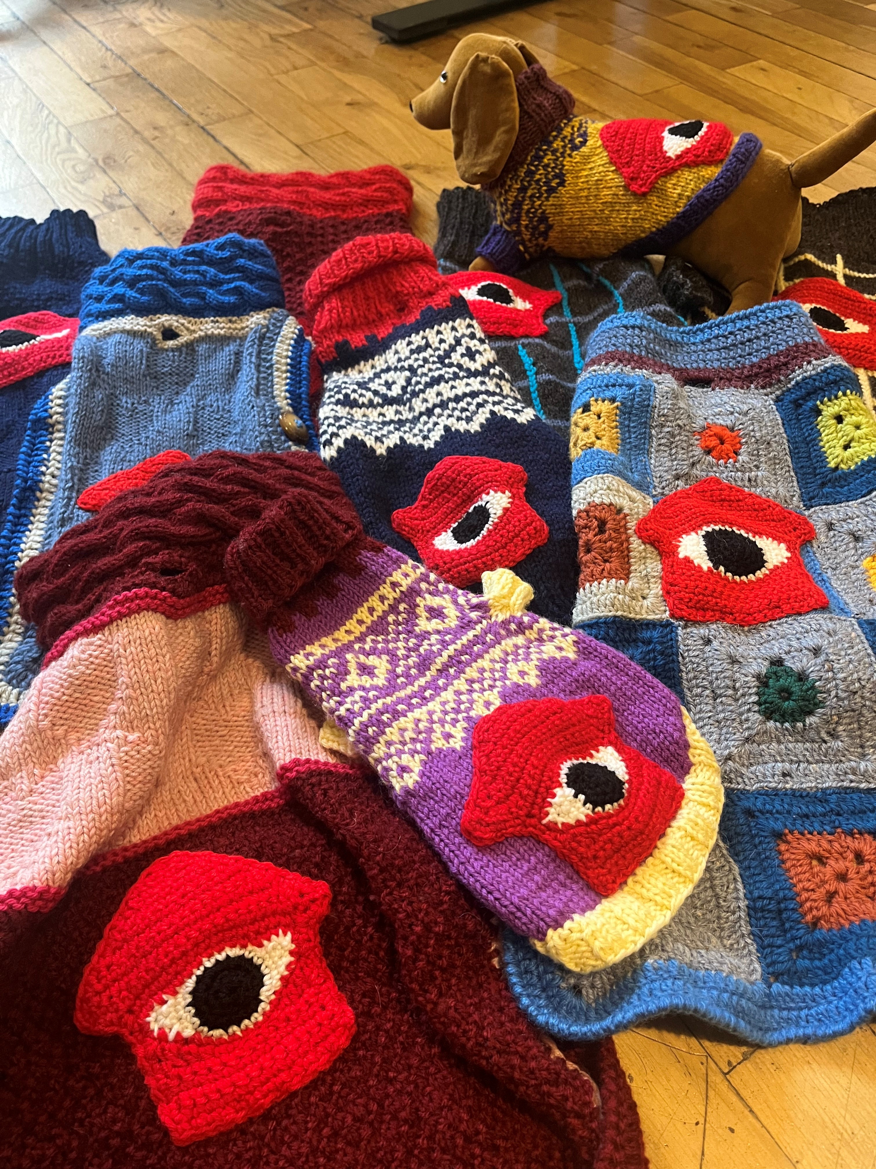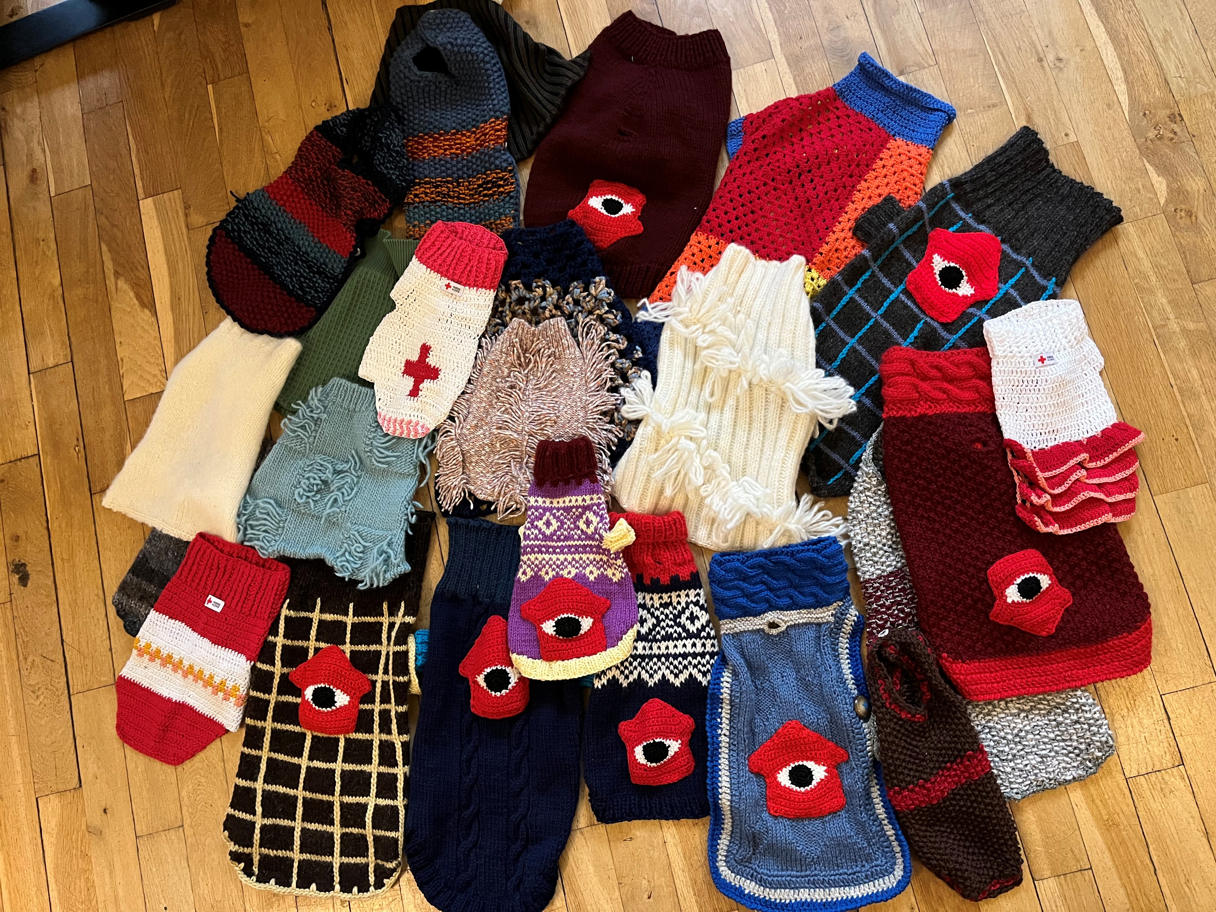 Derfor er vi gået sammen med Røde Kors' frivillige strikkere, Nørklerne, om at få lavet 30 forskellige hundeveste med Nabohjælps-logo.